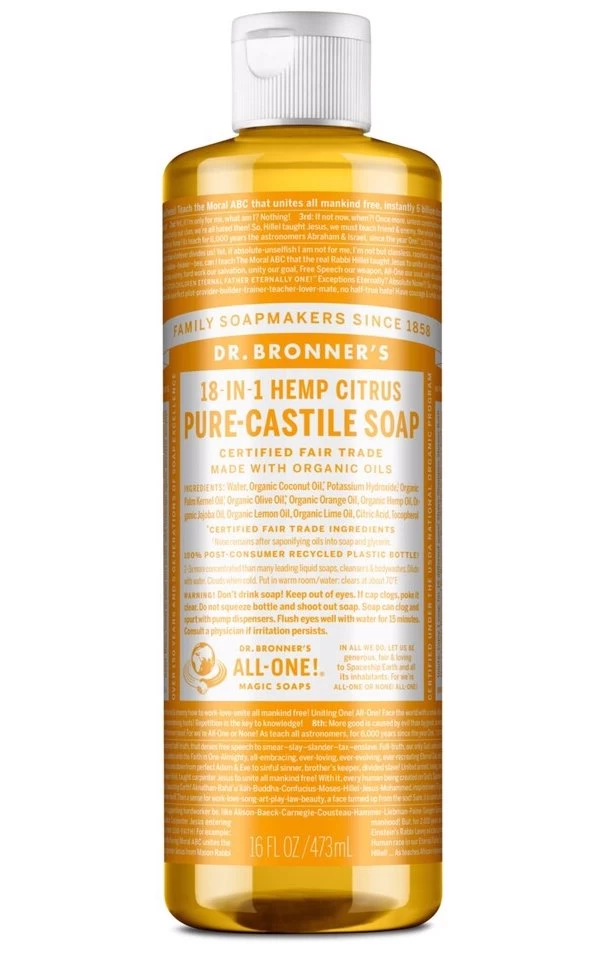 Dr. Bronner’s 18-in-1 Pure-Castile Soaps are good for just about any cleaning task. Face, body, hair & food, dishes, laundry, mopping, pets—clean your house and body with no synthetic preservatives, detergents or foaming agents—none!