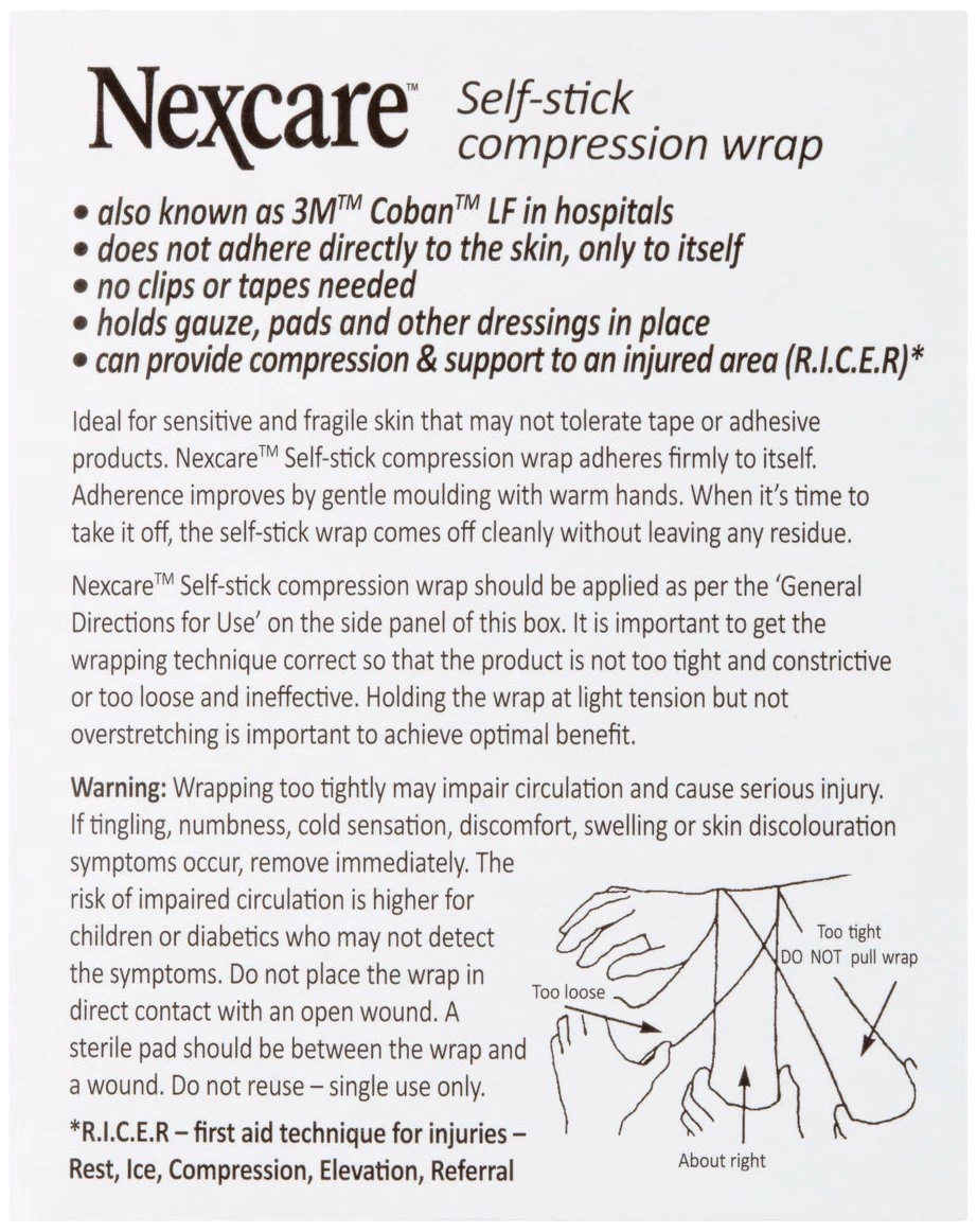 Nexcare Self Stick Compression Wrap is a breathable, self-adherent wrap. Ideal for securing dressings to fragile or sensitive skin, including for children or the elderly.