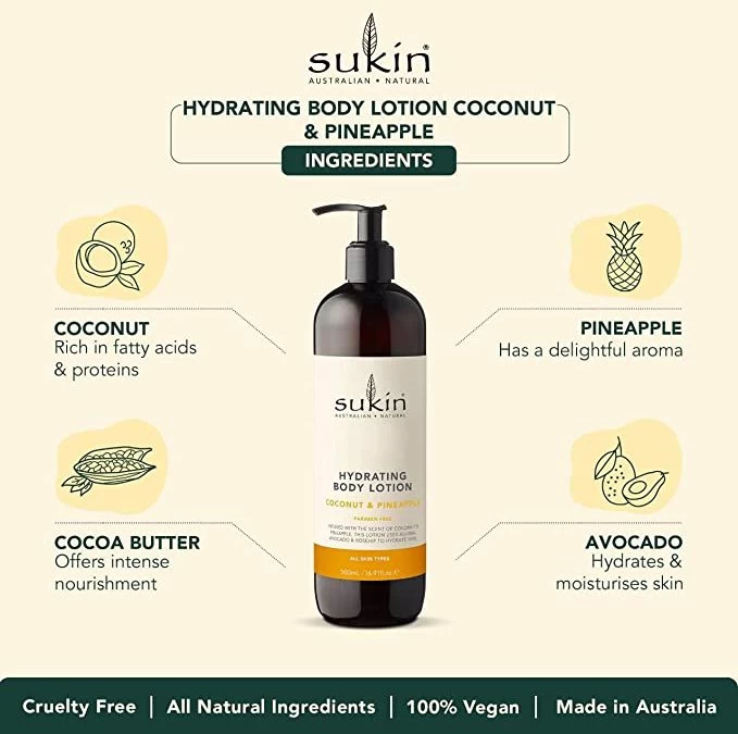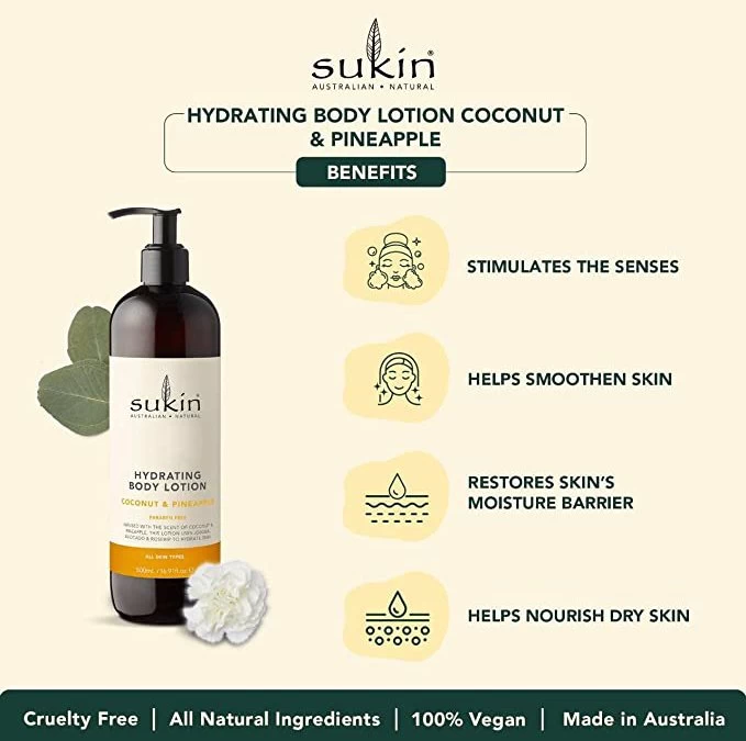 APPLICATION: Massage into dry or damp skin. Rapidly absorbed to deliver long lasting softness and protection. For best results apply on damp skin after using your favourite Sukin Body Scrub.