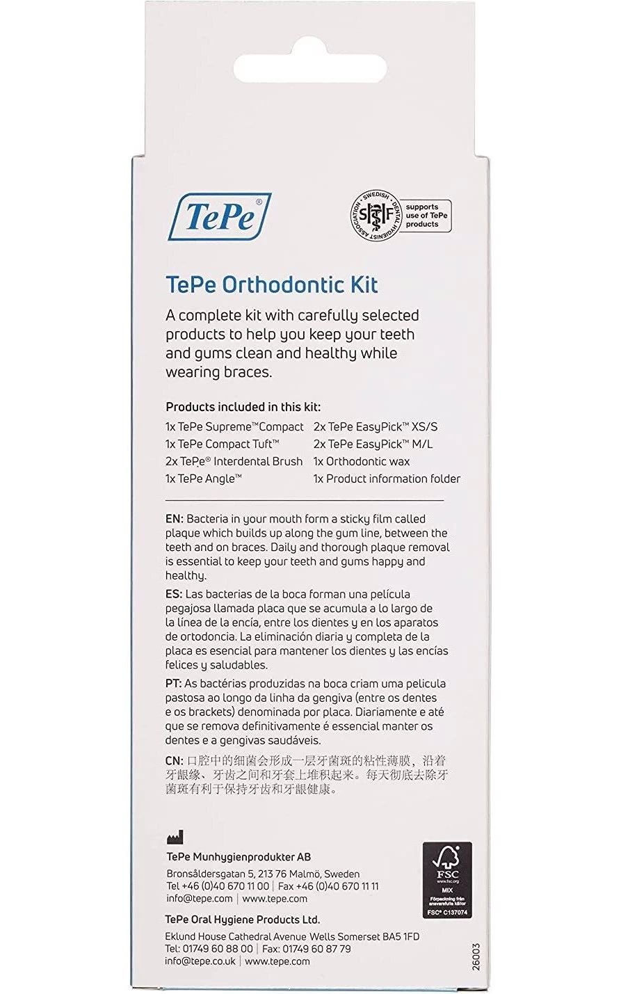 The TePe Ortho Kit provides the essentials for successful orthodontic treatment. The kit includes a brush for cleaning hard-to-reach areas and interdental brushes for removing plaque from between teeth. Its ergonomic handle makes it comfortable to use and ensures safe and efficient brushing. This complete oral hygiene set makes it easy to maintain healthy teeth and gums.