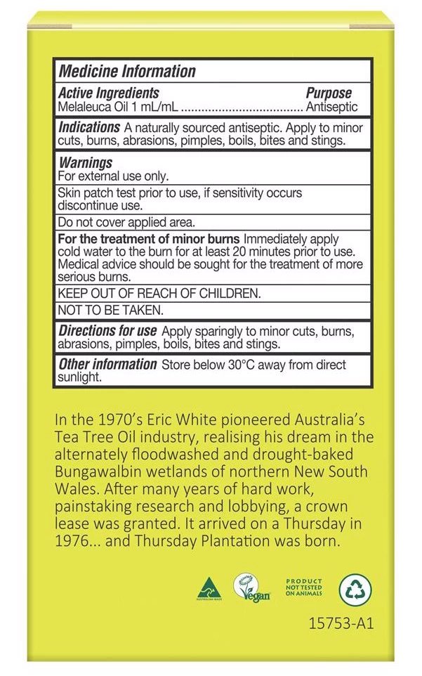 - The germicidal active in Thursday Plantation Tea Tree Oil, terpinen-4-ol, is at least 30% greater than International and Australian standards.